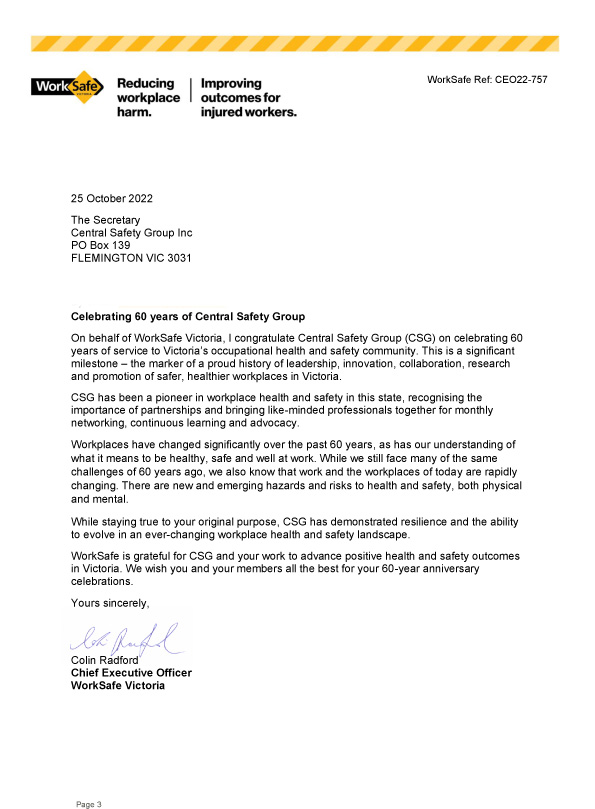 View CSG 60th Congratulations letter from Colin Radford, CEO, WorkSafe Victoria Read WorkSafe Victoria's congratulatory letter for our 60th anniversary:
